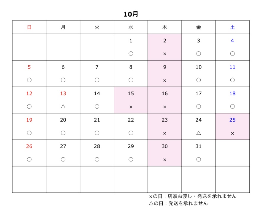 お渡し・発送可能日はカレンダーをご参照ください。